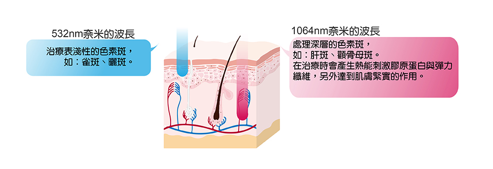 而淨膚雷射屬於雙波頻的治療,532nm短波長可以治療表險性的色素斑(如雀斑);1064nm常波長則被利用來治療較深的真皮性色斑(如肝斑、顴骨母斑等)。除了上述問題外,透過淨膚雷射1064nm波長輔助,還可調節皮膚免疫反應,穩定肝斑及改善青春痘問題。